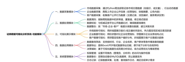 该系统的主干功能涵盖了从证券数据的“收集 - 加工 - 呈现 - 应用”的全过程,具体包括:利用 Python 爬虫抓取市场交易、上市公司公开信息及客户行为偏好等合规数据;借助 Python 进行数据清洗、验证与整合,保障数据精确性;运用 Echarts 制作折线图、柱状图、饼图等多种可视化图表,直观展示市场动向、客户分布和企业运营状况的多维数据;同时支持数据查询、筛选及导出功能,为证券公司优化内部管理、精准定位潜在用户、提升客户服务品质提供数据支持,满足合规审查与业务决策需求。