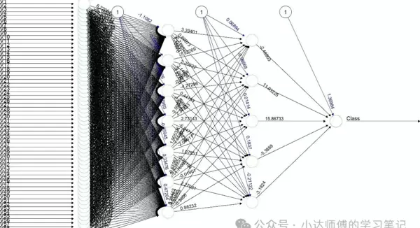 网络的学习流程可概括为“预测—计算误差—反向传播—更新权重”的循环过程,类似于学生通过练习和改正错误不断提升成绩。R的neuralnet包已内置这一机制,只需设置网络结构即可自动完成。