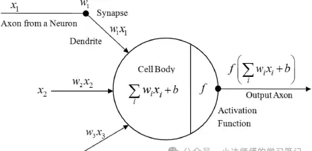 图2是把生物过程转化为数学语言的抽象表达。输入信号(向量x)经过权重矩阵W的加权处理,加上偏置项b,再通过激活函数f(·)的非线性转换,最终产生输出y。这个过程将突触强度转变为权重参数,生物开关抽象为数学公式。