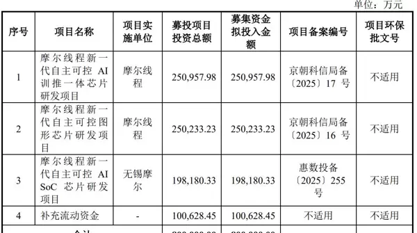 此次申请上市,摩尔线程计划募集资金80亿元,将用于新一代自主可控AI训推一体芯片研发项目、新一代自主可控图形芯片研发项目、新一代自主可控AISoC芯片研发项目,以及补充流动资金。