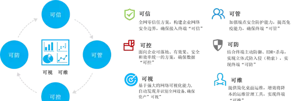 - 终端桌面管控: 涵盖终端安全基线完善与加固、终端标准化管理、运维简化管理及软件正版化和标准化管理。