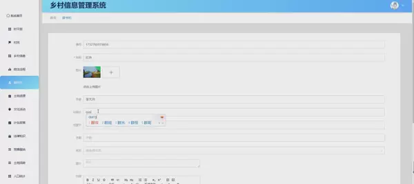 随着乡村振兴战略的深入实施,乡村信息管理系统的开发与应用成为提升乡村治理效能和信息化水平的关键手段。本系统采用Java语言进行开发,结合Spring Boot框架和MySQL数据库,构建了一个功能全面、操作便捷的乡村信息管理平台。系统涵盖了从基础信息管理到互动交流的多个模块,旨在为乡村治理提供全方位的支持。村干部可以通过系统处理乡村信息、政法法规、土地资源等核心数据,实现高效的信息管理和决策支持。村民则可以查阅读书栏目、文化活动、计划生育政策等信息,参与乡村治理。系统还支持党员分类、党员信息管理及党组织活动记录,强化了基层党组织的建设。系统提供了投诉建议、党群论坛等互动模块,促进村民与政府之间的沟通交流。通过整合现代信息技术,本系统不仅提高了乡村治理效率,还增强了村民的参与度和满意度,为乡村振兴提供了强有力的技术支持。