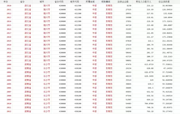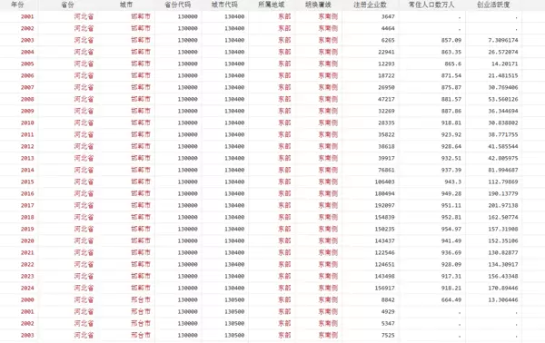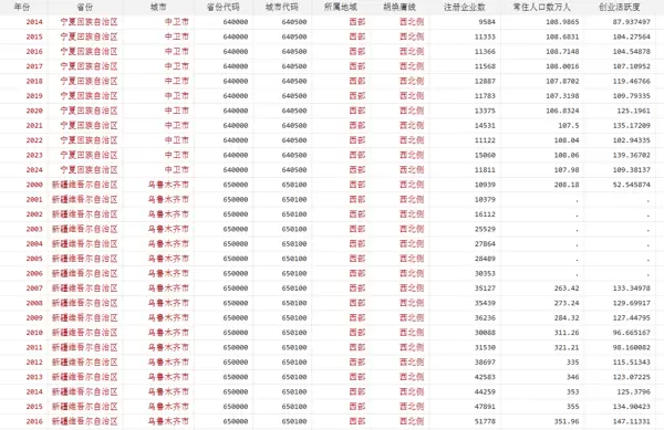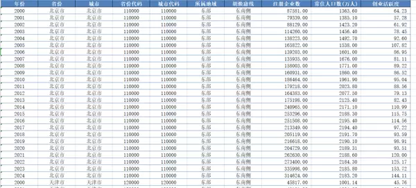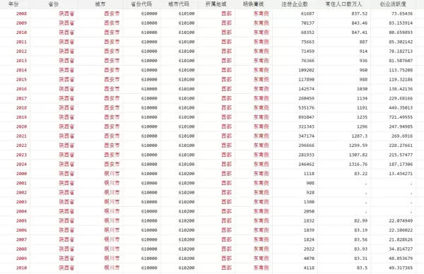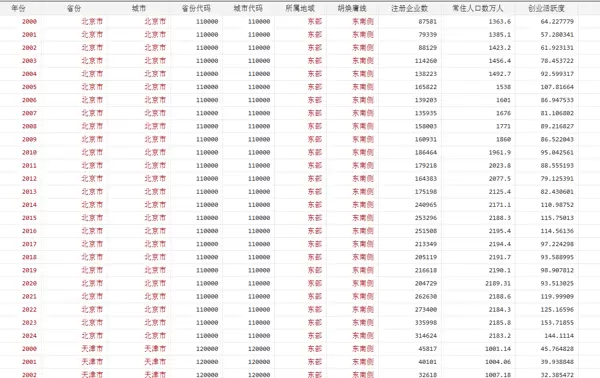 创业活跃度是评估区域经济活力与未来竞争力的重要指标。长三角、粤港澳大湾区及北京长期占据全国前列。同时,一批经济实力较强的二线城市——如成都、杭州、苏州、武汉、南京等——近年来也表现出明显的提升趋势。在本文中,各地级市的创业活跃度通过“每万人新注册企业数量”来计算,具体公式为: ?创业活跃度 = 新注册企业数量 / 常住人口总数