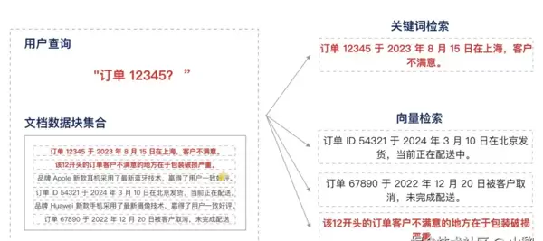 混合检索(Hybrid Search)通过结合关键词搜索和语义匹配的优势,可以首先利用关键词搜索精确定位到“订单12345”的信息,然后通过语义匹配扩展与该订单相关的其他背景或客户操作的信息,例如“以12开头的订单、包装破损严重”等。这不仅能够获取精确的订单详情,还能获得与其相关的重要附加信息。