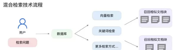 混合检索是指在检索过程中同时采用多种检索方式,并将各类结果融合,从而得到最终的检索结果。混合检索的优势在于能够充分利用不同检索方法的优点,弥补各自的不足,提高检索的准确性和效率。下图展示了混合检索的过程: