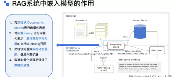 在RAG系统中,嵌入模型(Embedding Model)扮演着关键角色,负责将文本数据映射到高维向量空间,以便高效检索和处理。具体而言,嵌入模型将输入的文档片段(Chunks)和查询文本(Query)转换为嵌入向量(Vectors),这些向量捕捉了文本的语义信息,并可在向量空间中与其他嵌入向量进行比较。