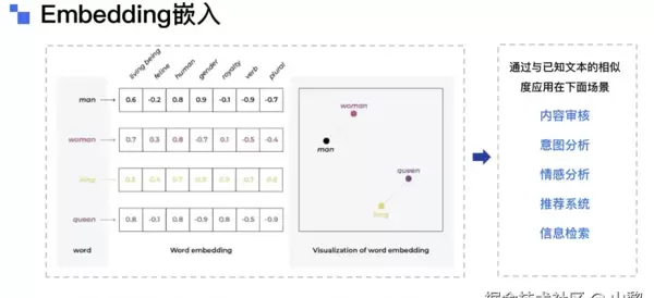 在具体实现中,嵌入的每个维度通常对应文本的某种特征,例如性别、类别、数量等。通过多维度的数值表示,计算机能够理解并解析文本的复杂语义结构。例如,“man”和“woman”在描述性别维度上具有相似性,而“king”和“queen”则在性别和王室身份等维度上表现出相似的语义特征。