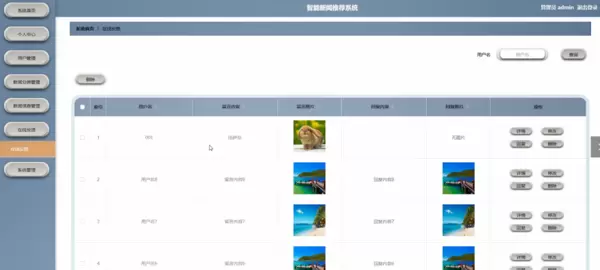 智能新闻推荐系统的设计目的是帮助新闻管理者更加高效轻松地进行日常管理工作,因此作为一个工具,该系统应设计得易于上手使用,整个系统界面需简洁明了、清晰易懂,并且一定要为用户提供必要的提示信息,如登录时用户密码或用户名输入错误时要给予提示。总之,必须从使用者的角度出发,去设计用户操作界面[14]。