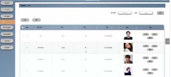 管理员点击用户管理,在用户管理页面输入账号、姓名、性别、手机、头像等信息,然后进行查询、新增或删除用户信息等操作,如图5-10所示。