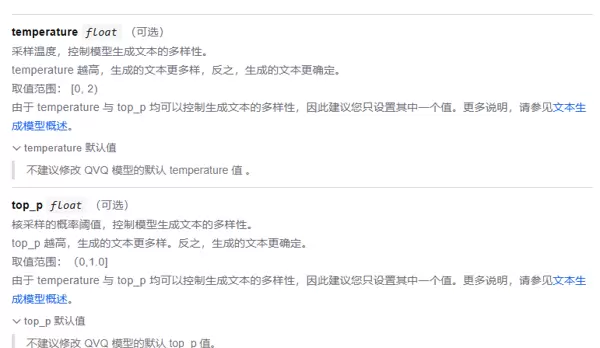 参考:进入阿里云的dashscope(https://dashscope.console.aliyun.com/),dashscope网页->模型广场->(任选一个模型) API详情,然后查找Temperature及Top P参数。