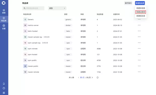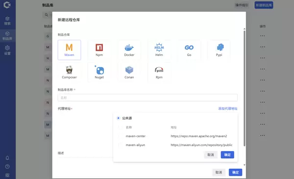 点击新建制品库,选择新建远程库,输入相关信息并确认即可。