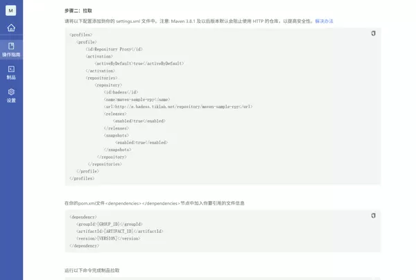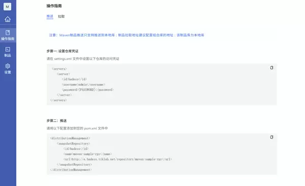 - 进入制品库界面,点击右上角操作指引选择maven,进入操作指引界面。替换相应的文本并添加至 settings.xml 文件中。