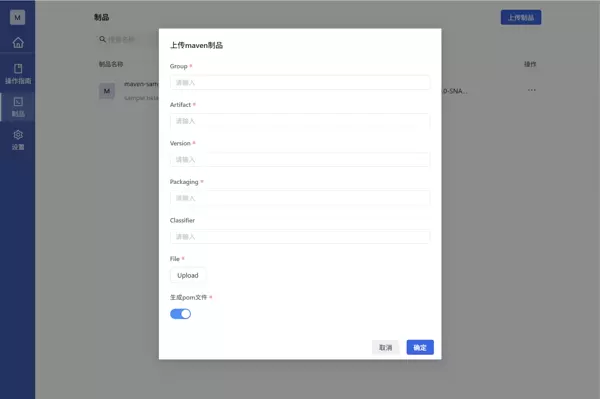 在Maven制品库的制品界面点击右上角的上传制品,只有本地local库支持通过界面上传。适用于:第三方仅有 jar 包或压缩文件的情况,不适用于已有 pom.xml 文件的情况。
