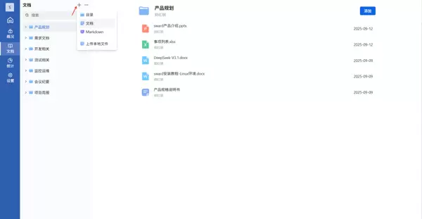 点击左侧导航栏中的文档->新增,可为知识库添加目录、文档、markdown或上传本地文件。