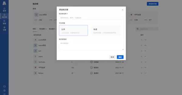 | 可见范围 | 必填 | 公开:系统中的所有成员均可查看此知识库 私密:仅被添加到此知识库的成员可以查看 |