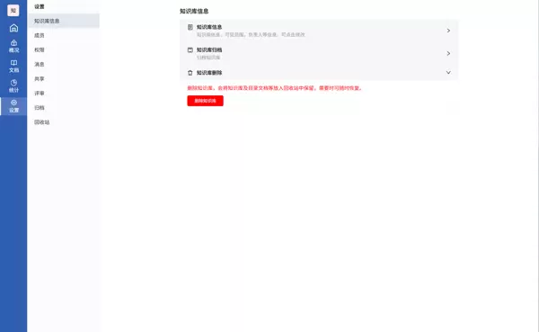 点击删除知识库,会将数据库及其文档、目录移至回收站。支持从回收站恢复数据和清空。