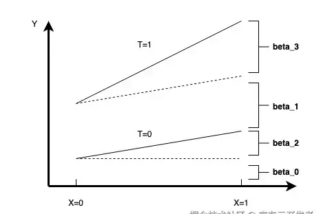 Y=β0+β1·T+β2·X+β3·X·TY=β0·+β1··T+β2··X+β3··X·T