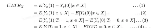 | CATE | Conditional Average Treatment Effect | 条件平均处理效应 | 满足特定条件的实验对象的平均效果 | CATEX=E[Yx(1)-Yx(0) | x∈X] |