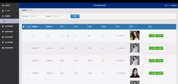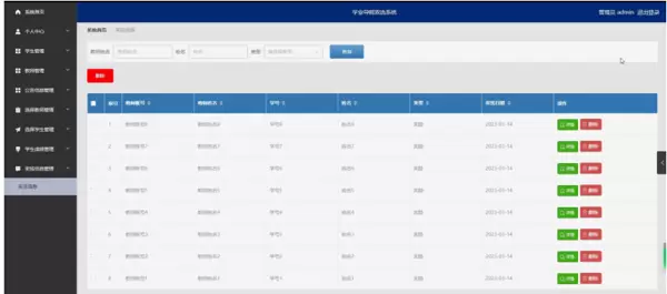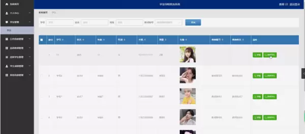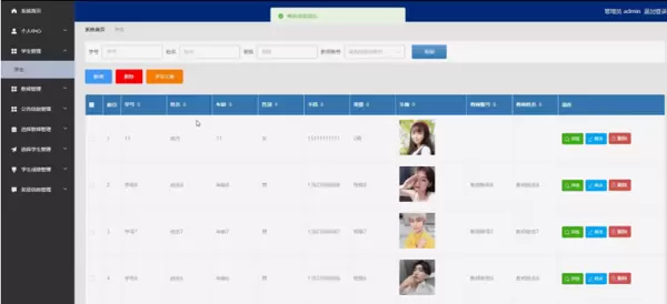 管理员登录本系统后,可以管理个人中心、学生管理、教师管理、公告信息管理、选择教师管理、选择学生管理、学生成绩管理、奖惩信息管理等功能模块;点击学生管理,管理员可以管理学生。如图 5-3 所示。