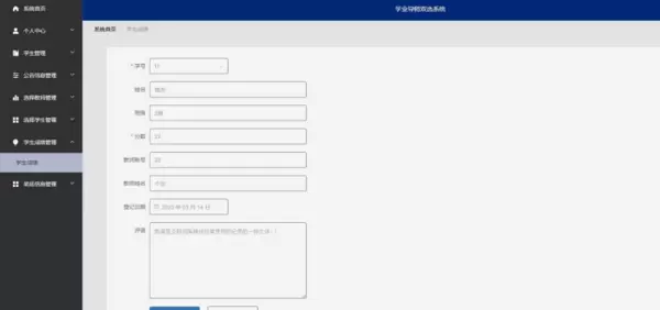 学生登录后,可以管理系统首页、个人中心、教师管理、公告信息管理、选择教师管理、选择学生管理、学生成绩管理和奖惩信息管理;具体操作页面如下图所示。