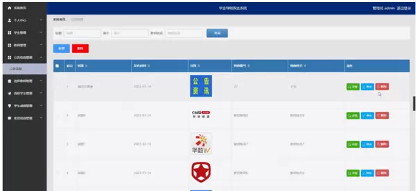 管理员点击公告信息管理,可以通过输入标题、简介、教师姓名对公告进行查询、新增、删除的操作,并可以查看公告详情并修改和删除。具体操作如下图所示。