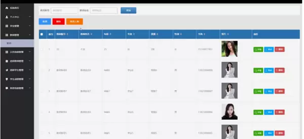 点击教师管理,管理员可以通过输入教师账号、教师姓名查看系统已有的教师信息,并进行查询、新增、删除和教师人数统计的操作,还可以在线对教师信息进行详情查看、修改和删除。如图 5-4 所示。