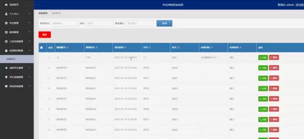 在选择教师管理页面,教师通过输入教师姓名、姓名和审核状态进行查询,并执行审批、详情及删除等操作。具体操作页面如下图所示。