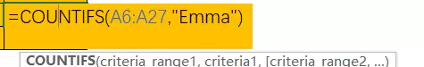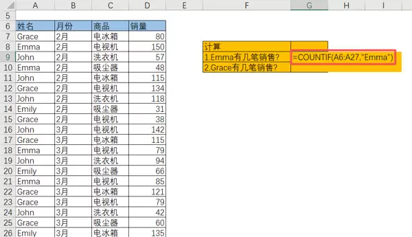 ①第一个变量选中区域,第二个变量指定条件,最终结果将显示在选定区域内Emma出现的次数;
