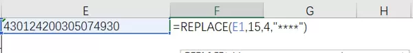 ②使用replace函数,第一个变量选择原始文本,从第15位开始的4个字符被替换为****: