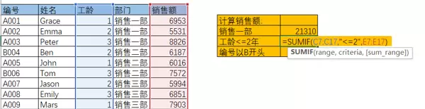e.g. 工龄小于等于两年的销售人员的销售额: