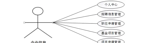 - (3)企业信息可以实现对个人中心、招聘信息管理、职位申请管理、基金项目管理、项目申请管理等信息进行操作,用例分析如图3-3所示。