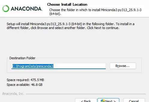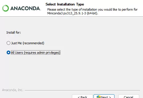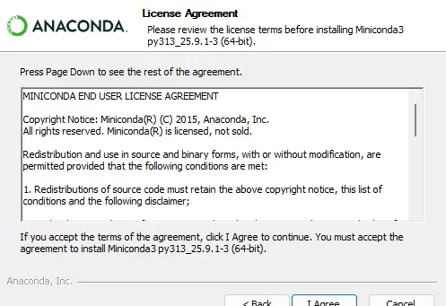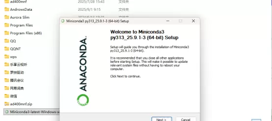 - Miniconda:仅包含 Conda 和 Python。安装文件较小(约50 MB),需要什么包再自己使用 conda install 或 pip install 安装,适合高级用户和磁盘空间有限的用户。