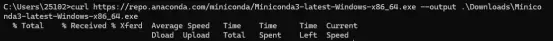 下载 Miniconda 安装包(这里我的 Windows 电脑是 64 位的,如果你也是,可以直接复制我的命令),在命令行输入:curl https://repo.anaconda.com/miniconda/Miniconda3-latest-Windows-x86_64.exe --output .\Downloads\Miniconda3-latest-Windows-x86_64.exe