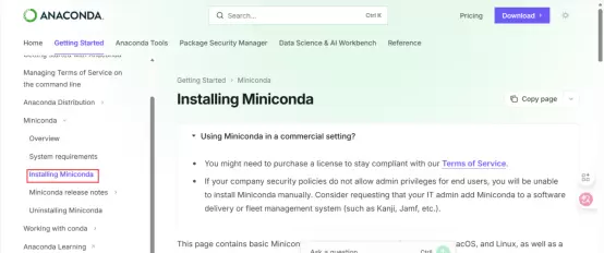 打开 Miniconda 官方文档页面,选择安装Miniconda:https://docs.conda.io/en/latest/miniconda.html