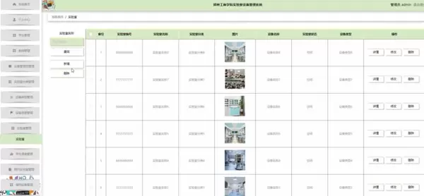 管理员点击实验室管理后,在实验室管理页面中对编号、名称、分类、图片、设备名称、状态及类型等信息进行查询、新增或删除操作,如图5-13所示。