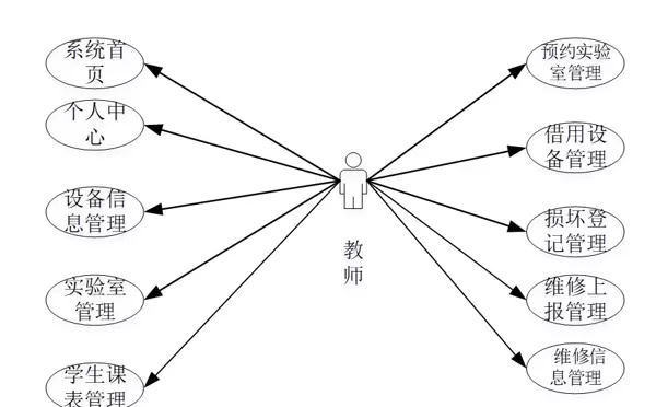 - (2)、教师关键功能包括系统首页、个人中心、设备信息管理、实验室管理、学生课表管理、预约实验室管理、借用设备管理、损坏登记管理、维修上报管理、 维修信息管理等有关功能。教师用例如下: