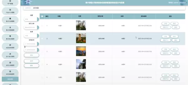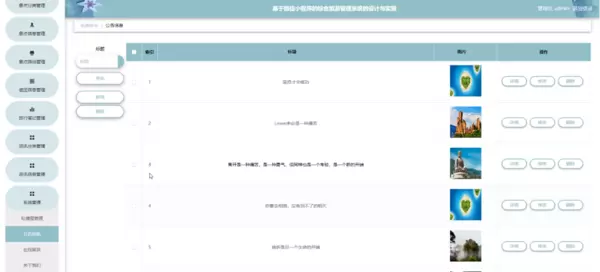 系统管理;在公告信息页面输入标题进行检索,新增或移除公告信息列表,并依据需求对公告详细资料进行查看详情、修改或删除操作;还可以对轮播图管理、在线留言、关于我们和系统简介进行详细操作;如图5-12所示。