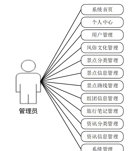 综合旅游管理系统的最高权限用户是管理员,通过系统首页、个人中心、用户管理、风俗文化管理、景点分类管理、景点信息管理、景点路线管理、组团信息管理、旅行笔记管理、资讯分类管理、资讯信息管理和系统管理等选项来对后台信息进行处理。管理员用例如图3-7所示。