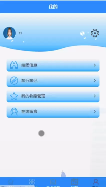 用户登录成功后,点击“我的”进入个人页面,在这里可以对组团信息、旅行笔记、我的收藏管理和在线留言等功能进行详细操作。用户功能界面如图5-4所示。