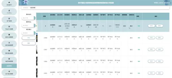 管理员登录进入小程序后可以查看系统首页、个人中心、用户管理、风俗文化管理、景点分类管理、景点信息管理、景点路线管理、组团信息管理、旅行笔记管理、资讯分类管理、资讯信息管理和系统管理等,并进行详细操作。如图5-6所示。