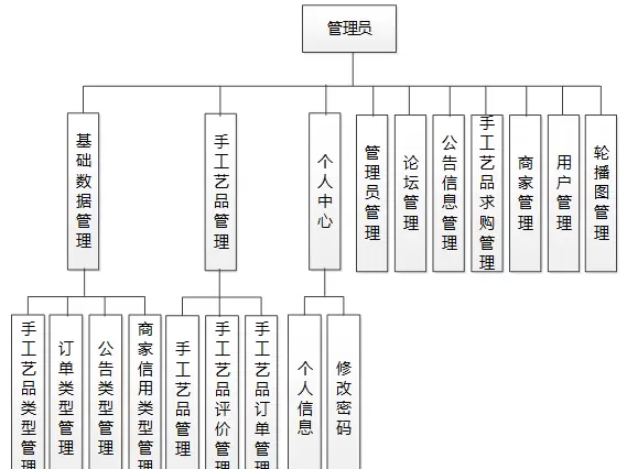 对管理员具体功能的设计结果将通过图4.1所示的管理员功能结构图来展示。管理员对于手工艺品销售系统操作的功能包括管理手工艺品信息,管理手工艺品求购信息,管理商家和用户,管理论坛帖子以及基础数据信息等。