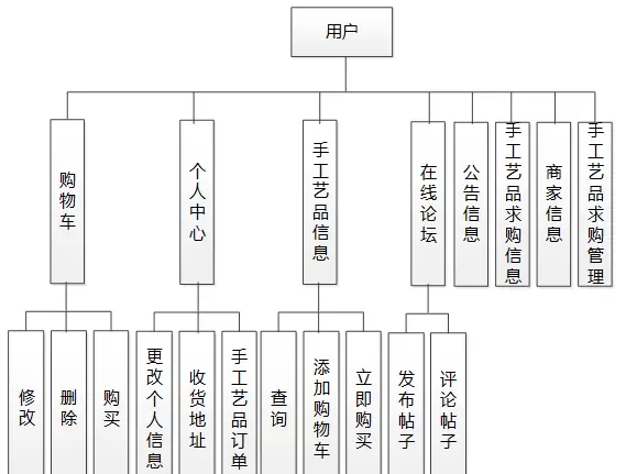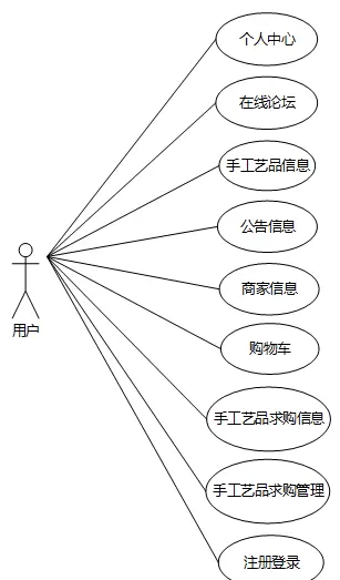 用户功能包括个人中心、在线论坛、手工艺品信息、公告信息、商家信息、购物车、手工艺品求购信息、手工艺品求购管理、注册登录等功能模块。
