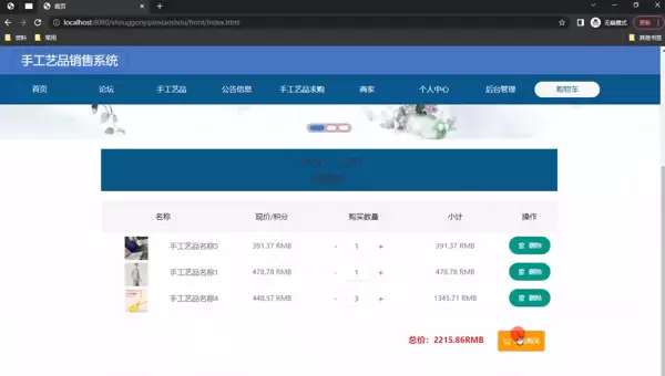 购物车:用户通过购物车下单结算需要购买的手工艺品;