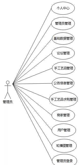 管理员对于手工艺品销售系统的操作权限包括管理手工艺品信息,管理求购信息,管理商家与用户,管理论坛帖子及基础数据等。其用例图如图3.4所示: