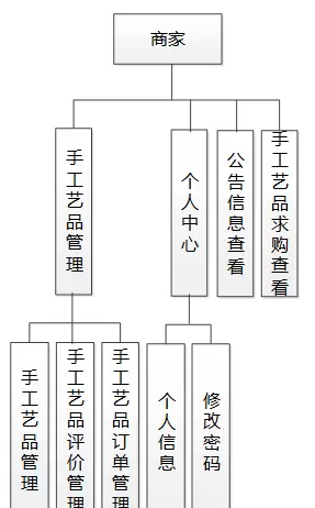 对商家具体功能的设计结果将通过图4.2所示的商家功能结构图来展示。商家对于手工艺品销售系统操作的功能包括管理手工艺品信息,回复用户对手工艺品的评价,管理手工艺品订单,查看手工艺品求购信息等。