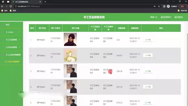 - 手工艺品求购管理:用户发布并管理求购信息,管理员同样可以执行相应的操作;