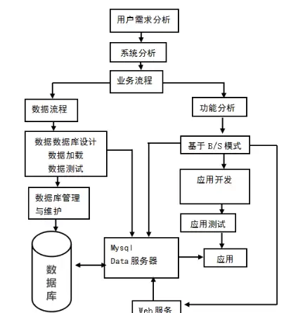 本系统的开发也有相应的流程,在开发前必须进行用户功能需求的分析,最终根据功能需求进行网站设计和数据库相关数据的设计工作。此次开发的协力服装厂服装生产管理系统开发流程如图所示。