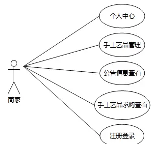 商家对于手工艺品销售系统的操作权限包括管理手工艺品信息、回复用户评价、管理订单以及查看求购信息等。其用例图如图3.5所示: