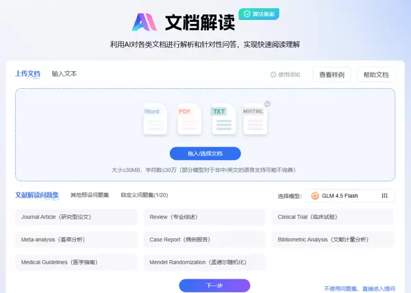 上传PDF或DOCX文档后,系统会先进行智能总结。这个功能简直是“文献焦虑”的救星——它自动提取文章基本信息、研究背景、核心结论和参考文献,在30秒内给你一份“文献速览”。就像考前先看大纲,你能快速判断这篇文献是否值得深读,该重点关注哪些部分。再也不用逐字啃完才发现“这文对我没用”。
