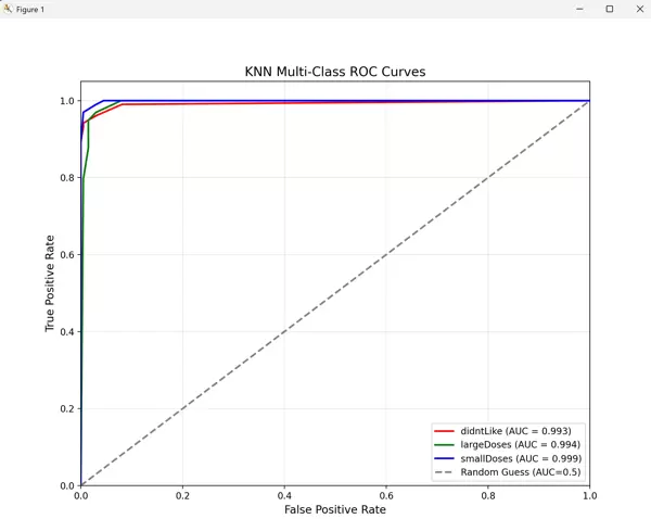 三类的 AUC 均接近 0.98,远高于随机猜测的 0.5,说明 KNN 对该数据集的分类区分能力很强。